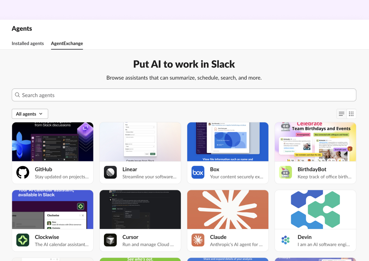 최고의 성과는 사람과 도구가 모두 연결될 때 만들어집니다. AgentExchange는 이제 모든 Slack 내에 있는 AI 에이전트를 한곳에서 관리할 수 있는 전용 공간입니다. Slack Marketplace에서 AI 기반 앱을 찾아 연결하고, 설치된 모든 에이전트를 한눈에 확인하며, 에이전트와 대화를 멈춘 최근 지점부터 바로 이어갈 수 있습니다. 이제 AI 노동 자원을 찾기 위해 여기저기 헤맬 필요가 없습니다. 이미 업무가 이루어지는 바로 그 공간, 하나의 허브에 모두 모여 있기 때문입니다.