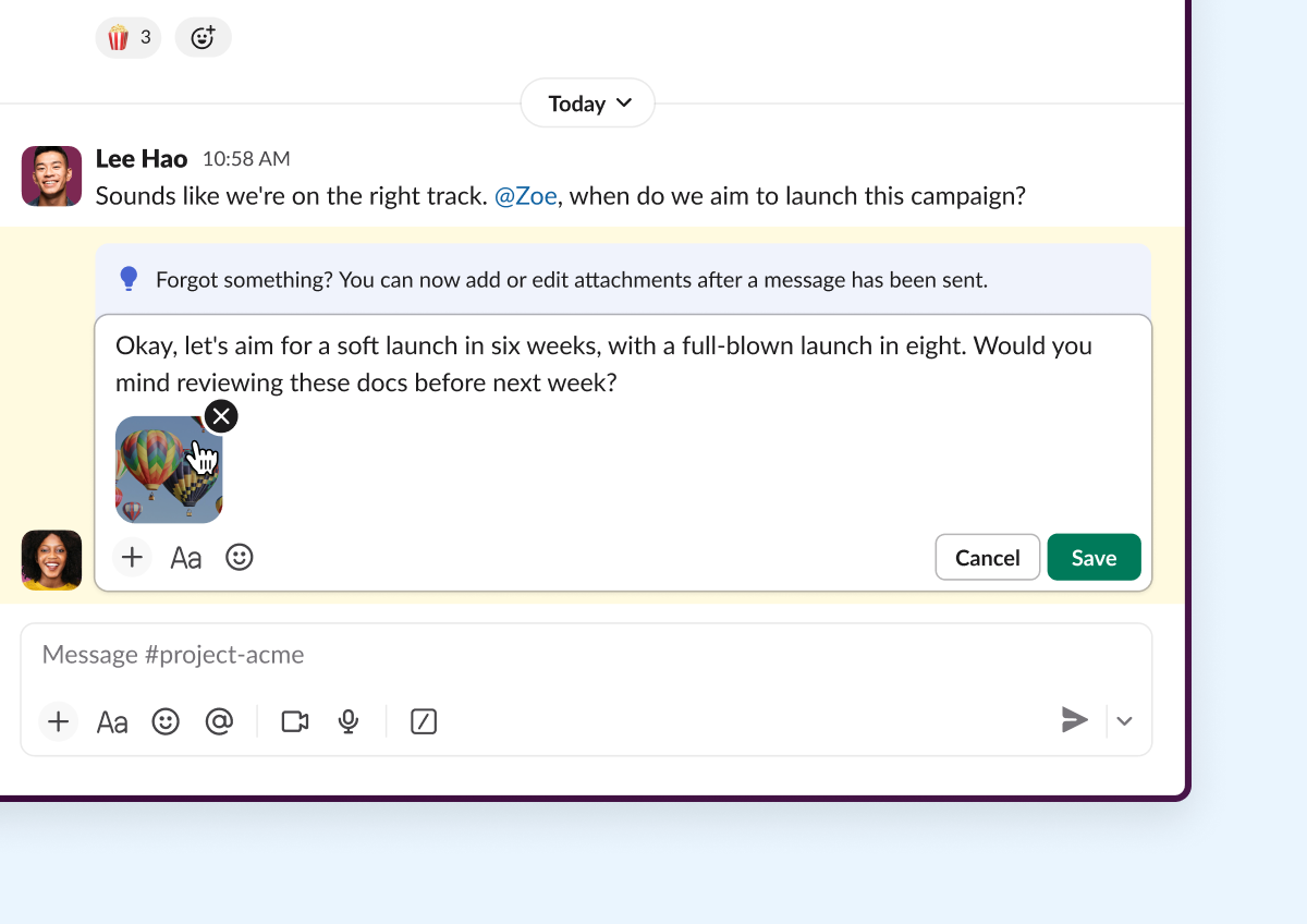- 전송 후 첨부 파일 편집: 처음부터 다시 전송할 필요가 없습니다. 전송한 후에도 수정할 수 있으니까요. 메시지 수정 시 이미지, 동영상, 문서, 캔버스 등 다양한 첨부 파일을 추가, 제거하거나 순서를 변경할 수 있습니다. 빠르게 수정하고 다음 작업으로 넘어가세요(Pro, Business+, Enterprise 플랜).