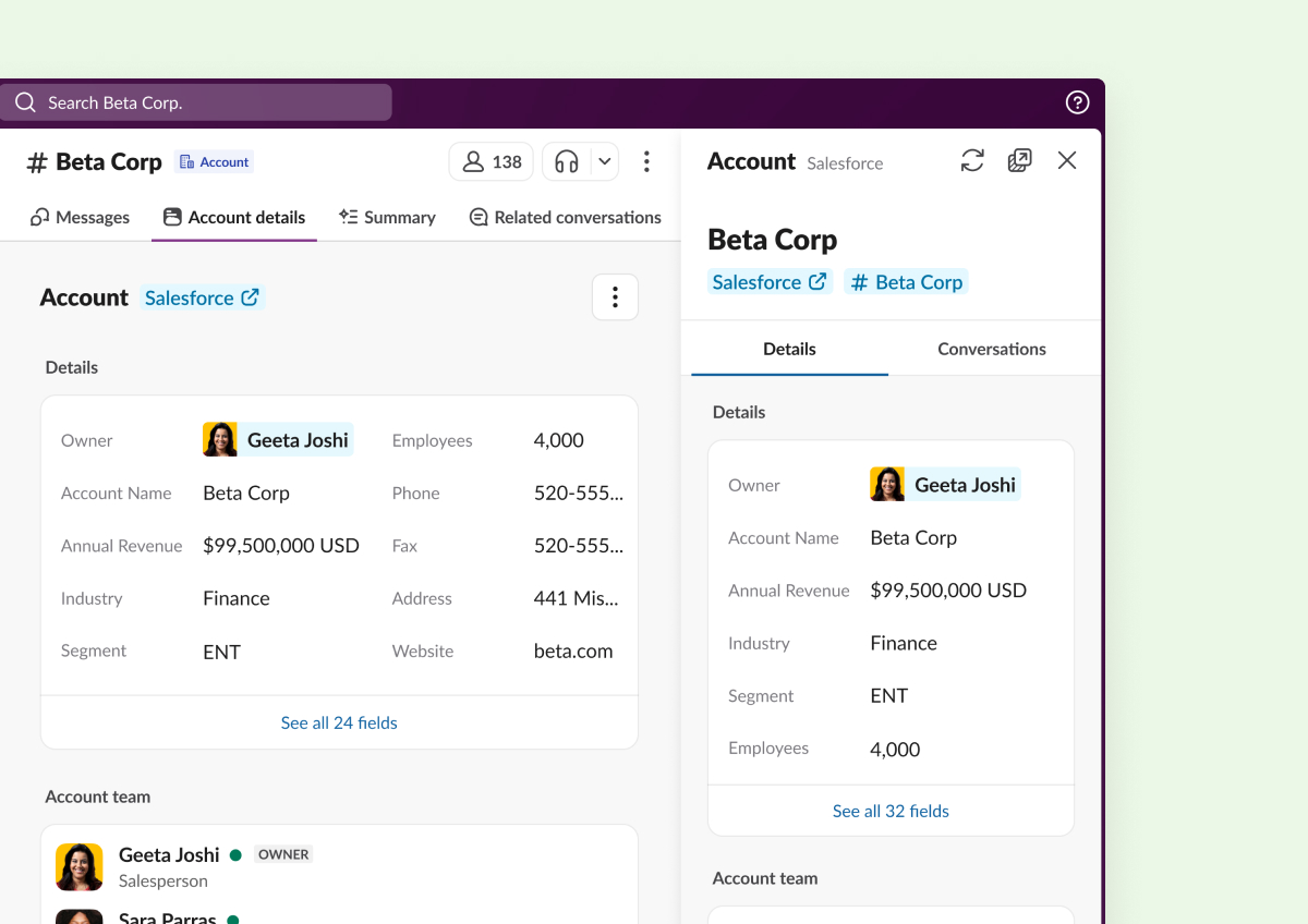Slack CRM을 넘어, 이제 팀이 Slack 안에서 직접 고객 기록과 데이터를 더 쉽게 확인하고 관리할 수 있도록 기능을 지속적으로 개선하고 있습니다. 이를 통해 업무 흐름을 보다 매끄럽게 이어갈 수 있습니다.