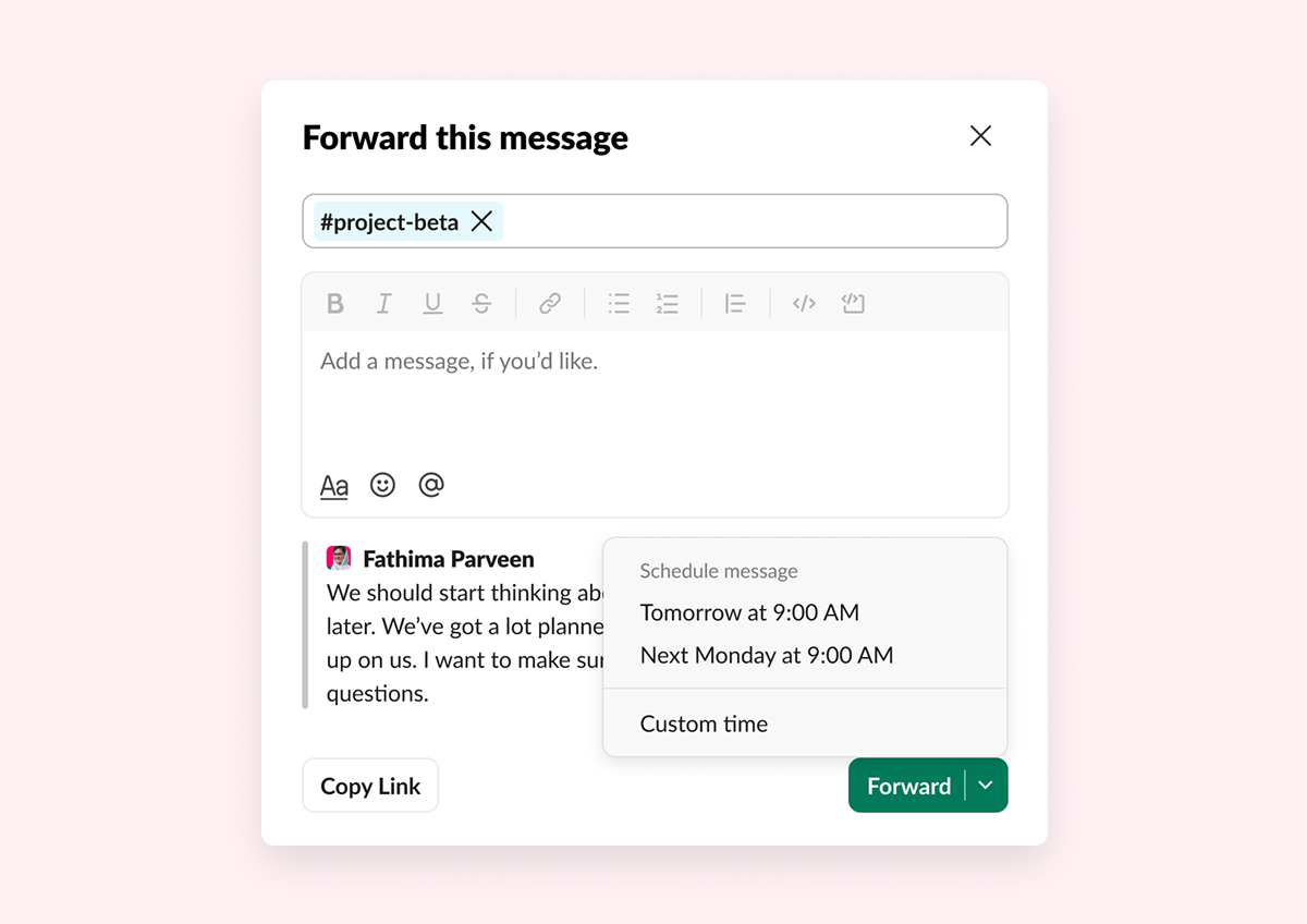 - 전달 메시지 예약 전송: 모든 메시지가 밤 11시에 전송될 필요는 없습니다. 이제 메시지를 전달할 때 정확한 전송 시간을 예약할 수 있어, 필요한 정보가 적절한 시각에 원하는 사람에게 전달됩니다.