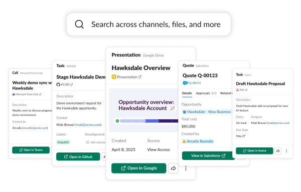 정보는 대화, 파일, 수많은 도구 등 어디에나 존재합니다. 정보를 찾기가 어려울 때 직원들은 업무 처리가 아니라 정보 검색에 시간을 사용하게 됩니다. 그래서 Slack은 올해 초 엔터프라이즈 검색을 출시하여 타사 앱과 드라이브를 Slack에 연결하고, 회사의 모든 지식과 데이터를 위한 검색 가능한 중앙 허브를 만들었습니다. 이로 인해 팀원들은 더 이상 앱을 오갈 필요 없이 단일한 대화형 방식으로 업무 흐름 속에서 바로 필요한 정보를 찾을 수 있습니다.