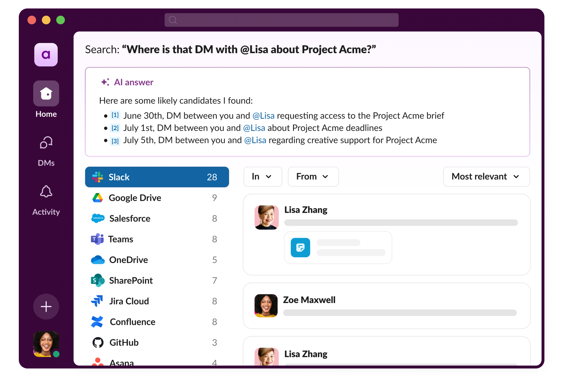 Slack의 엔터프라이즈 검색이 바로 이 문제를 해결해 드립니다. 엔터프라이즈 검색은 회사에서 진행된 모든 대화와 문서, 의사 결정 사항을 읽고 난 후 단편적 사실로부터 결론을 도출하여 필요한 정보를 제공하는 AI 어시스턴트처럼 작동합니다. 조직 내에 이미 존재하는 정보를 찾아 헤매는 번거로움을 없애주죠.